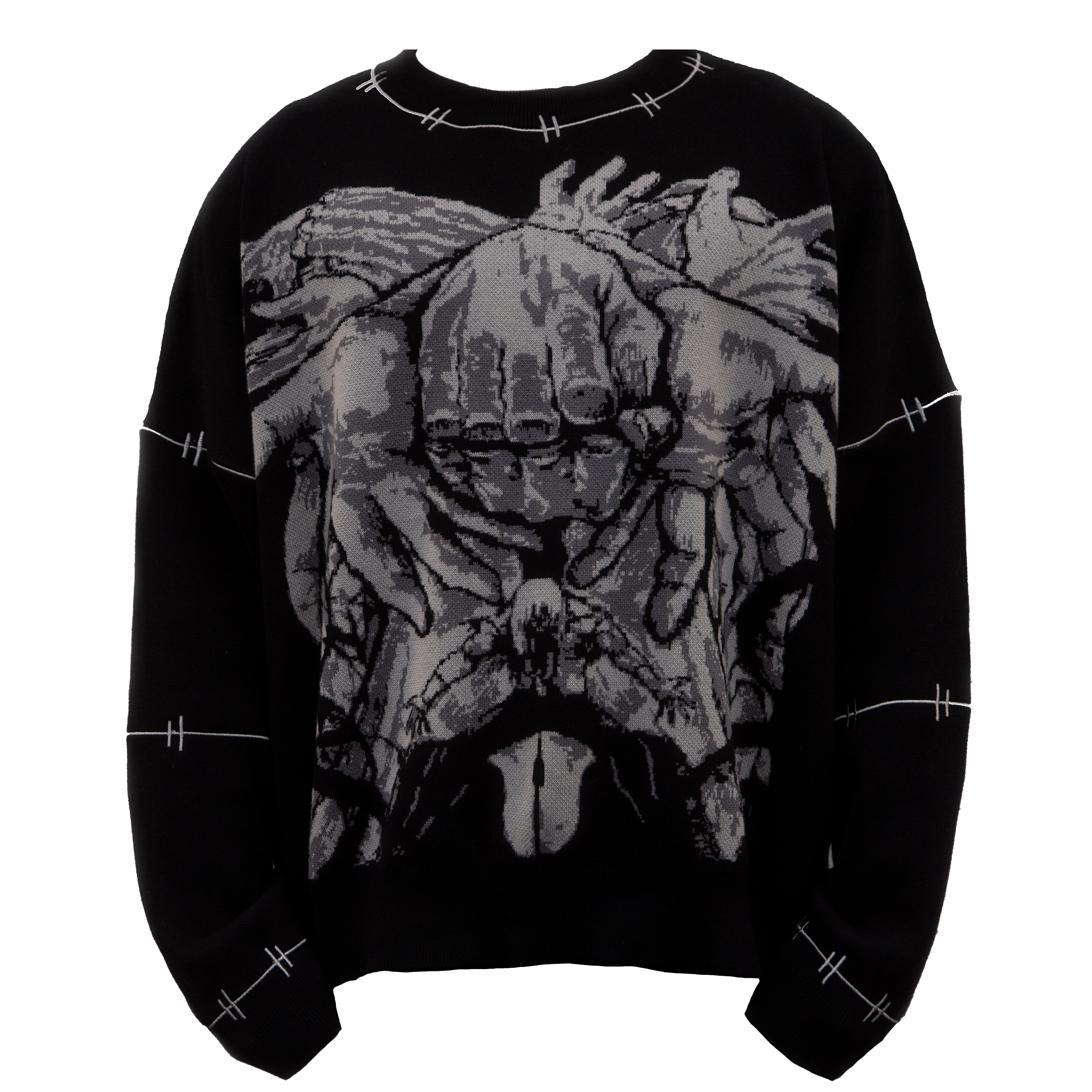Inspired by the anime ‘Jujutsu no Kaisen’, this cotton jacquard knit garment is designed with a focus on durability and comfort. The design features Mahito, with embroidered stitch marks on the sleeves reminiscent of his style. This piece promises a premium addition to your wardrobe that will stand the test of time.