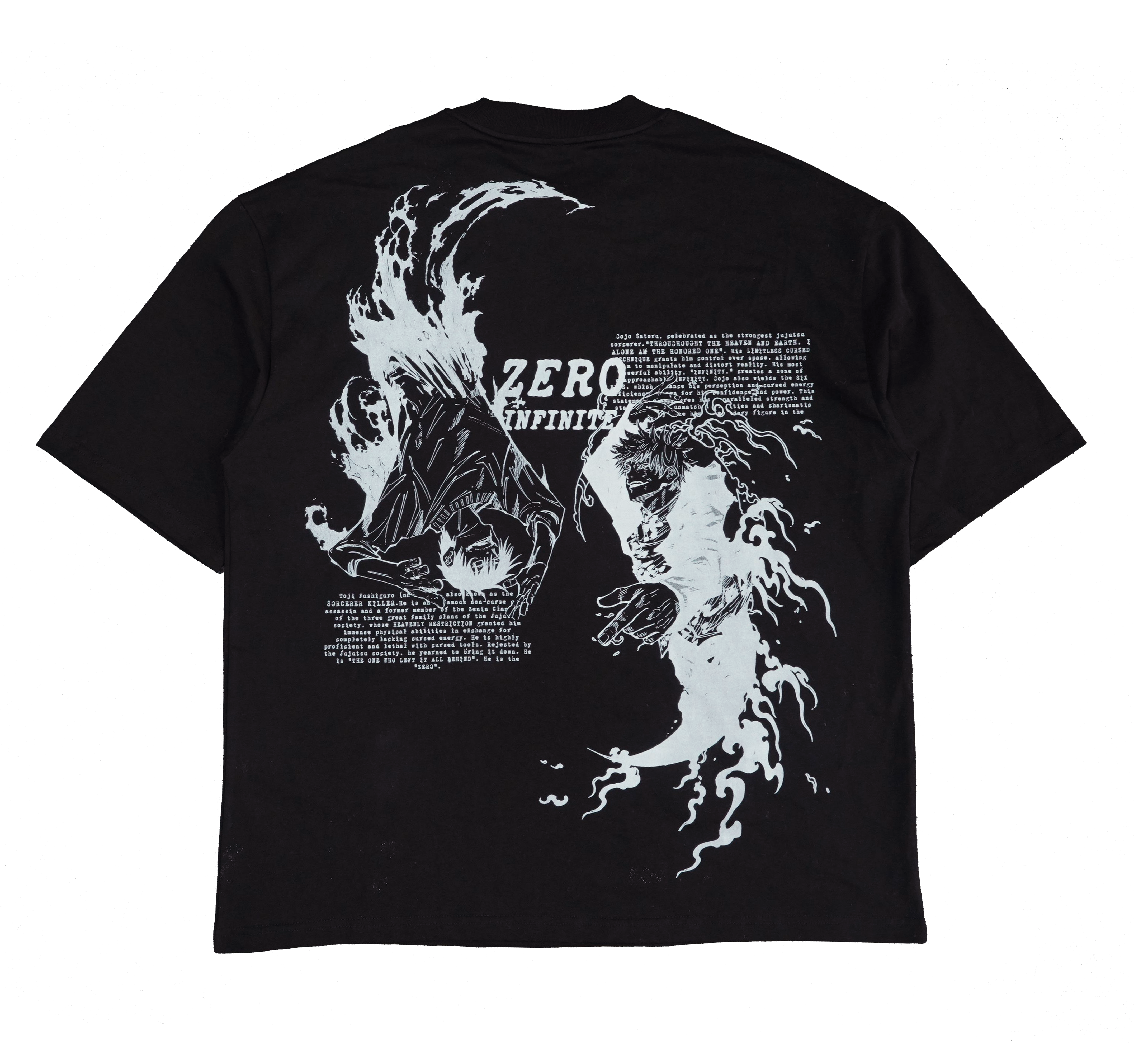 Oversized boxy fit. Inspired by the two most iconic characters from Jujutsu Kaisen: Gojo Satoru and Toji Fushiguro. One born with infinite power and the other born with zero. They are the Yin and Yang of this shirts backpiece.